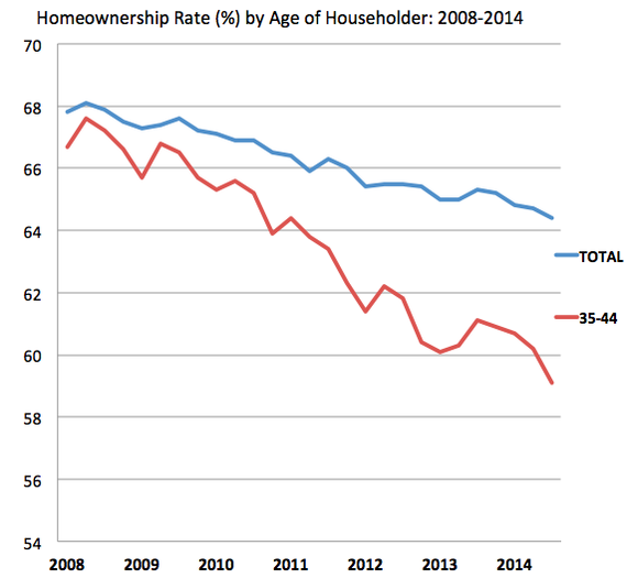 But there's another cohort turning away from homes even faster—Gen-X. That's right, Americans between 35 and 44 have had the sharpest drop in homeownership since the recession struck, far outpacing the national rate. (Pedant's note: Some people like to leave hateful comments about Y-axes that don't begin at zero, but it's almost impossible to see homeownership changes at that scale, so we're repeatedly violating that rule throughout this post.)
