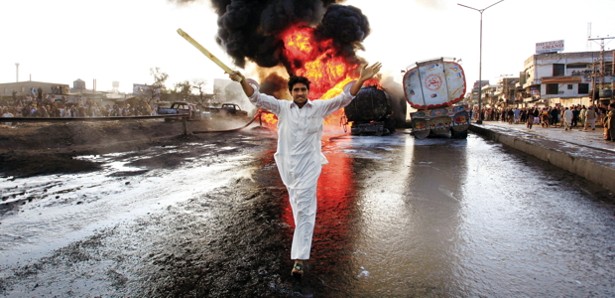 Peshawar, northwest Pakistan, February 8, 2011: Set ablaze by roadside bombs, oil trucks bearing fuel for NATO forces burn, as bystanders react. (Fayaz Aziz/Reuters)