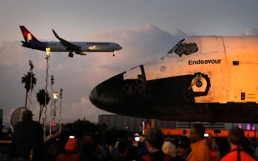 Read moreThe space shuttle Endeavour sits in a strip mall as a Hawaiian Airlines jet approaches a runway at Los Angeles International Airport in Los Angeles, on October 12, 2012. #