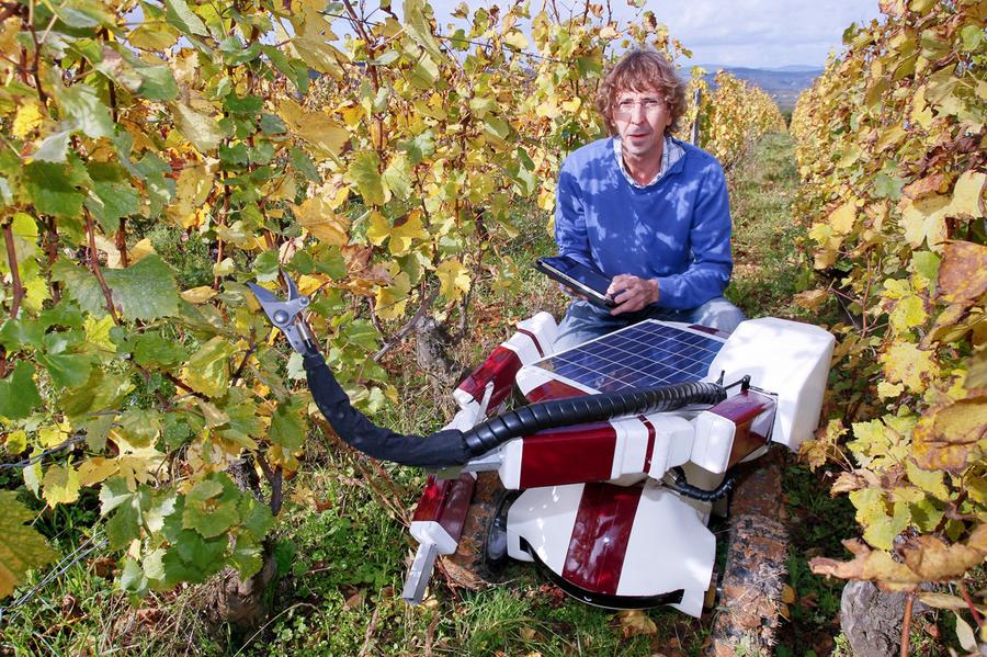 Read moreFrench engineer Christophe Millot stands with his Wall-Ye prototype, a robot designed to prune vines, in the Pouilly Fuisse vineyard during a press presentation near Macon, France, on October 12, 2012. The 50 by 60 centimeter robot, with four wheels and two metal arms, has six web cameras and a GPS and can roll between grapevines, test the soil and check the grapes. With a little more training, Wall-Ye will be able to prune up to 600 vines per day, says his inventor, who has been working on the project for the past three years. #