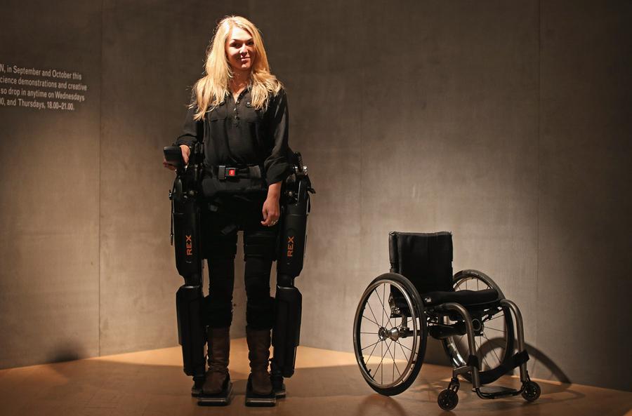 Read moreSophie Morgan walks with the aid of "Rex", a Robotic Exoskeleton at the Welcome Trust on September 19, 2012 in London, England. The system allows wheelchair users including fully paralyzed people, to stand upright and walk independently. Sophie was paralyzed from the breast bone down in 2003 following a car accident. #