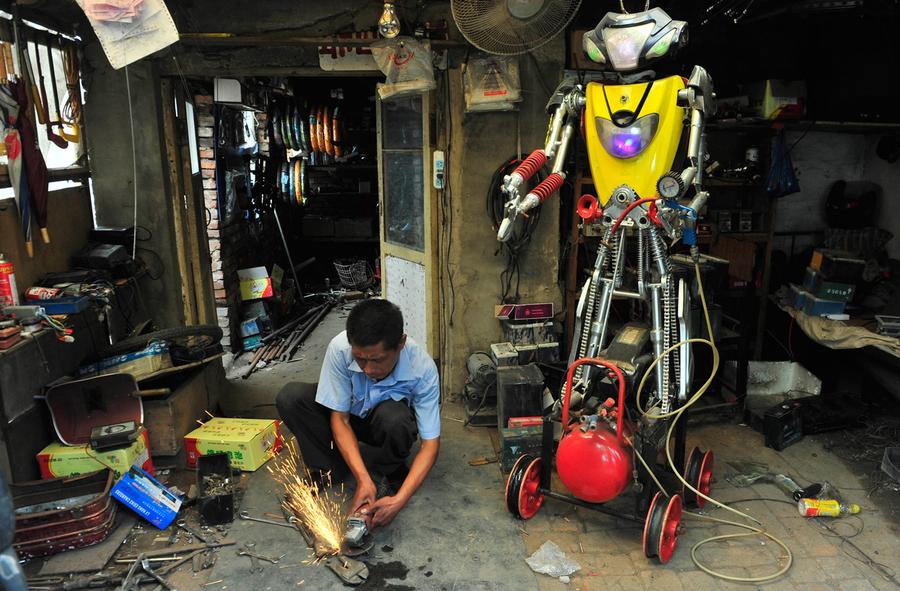 Read moreA 49-year-old electric bike mechanic who identified himself only as Wu welds a component to fit onto his newly-made robot at his repair shop in Shenyang, Liaoning province, China, on June 25, 2012. Wu spent over 10 days to make this nearly two-meter high robot using parts from abandoned electric bikes. The robot, which is able to walk and pump up tires by itself, is still under modification, according to local media. #