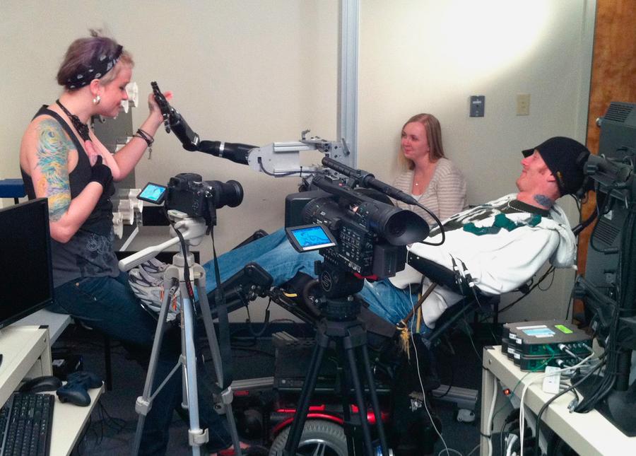 Read moreQuadriplegic research subject Tim Hemmes operates a mechanical prosthetic arm with Katie Schaffer during a testing sessions at a University of Pittsburgh Medical Center research facility in Pittsburgh. Hemmes had a chip implanted on the surface of his brain that reads his intention to move his paralyzed arm and sends that instruction instead to an advanced bionic arm. The goal is to create mind-controlled prosthetics to restore some independence to the paralyzed. #