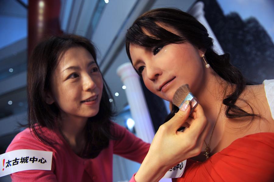 Read moreAkie Koh, a stylist from Japan, makes final preparations on the face of Geminoid F, a female robot, in Hong Kong, on March 28, 2012. The Geminoid F robot, developed by Ishiguro Laboratory in Osaka University and ATR Intelligent Robotics and Communication Laboratories, will be on display with other robots at City Plaza's "Robots in Motion 2012" exhibition from March 29 to April 15. #