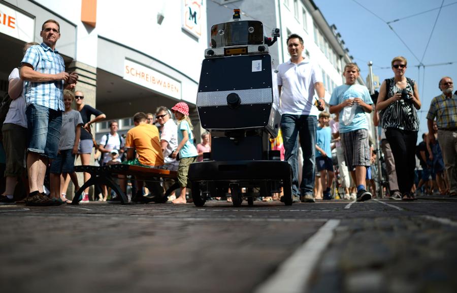 Read moreThe robot "Obelix" runs through Freiburg city center, on August 21, 2012. The machine, starting 9:45 in the morning at the University of Freiburg, found its way independently to a plaza in the center of Freiburg, about four kilometers away. Obelix made the journey, avoiding people and obstacles, in about 100 minutes. #