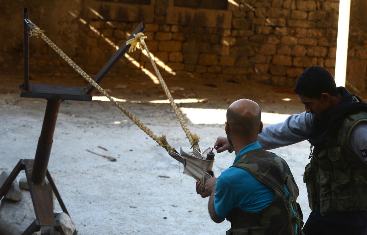Read moreSyrian rebels prepare to launch a bomb using a homemade slingshot in the northern city of Aleppo, on October 16, 2012. Lightly armed Syrian rebels who face the warplanes, artillery and tanks of loyalists have turned to making their own weapons, even rigging a video game controller to fire mortar rounds. #