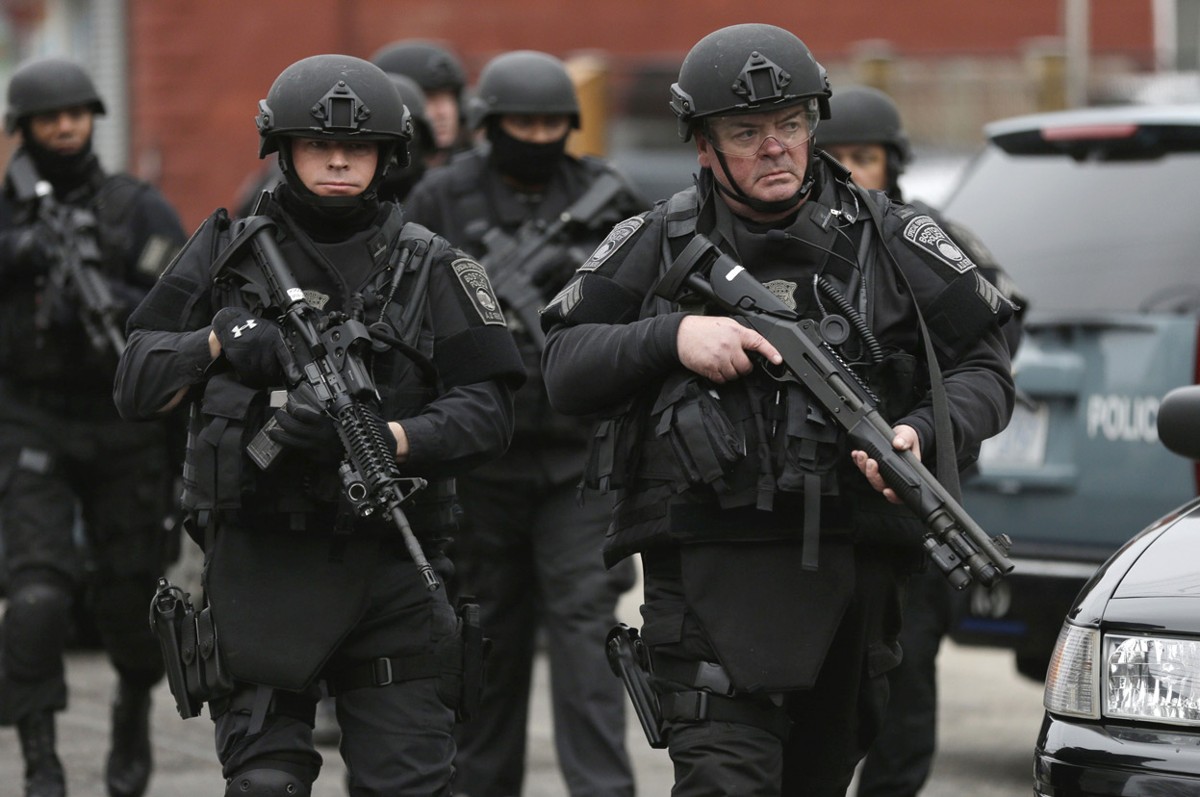 Read morePolice in tactical gear surround an apartment building while looking for a suspect in the Boston Marathon bombings in Watertown, on April 19, 2013. All residents of Boston were ordered to stay in their homes Friday morning as the search for the surviving suspect in the marathon bombings continued after a long night of violence that left another suspect dead. #
