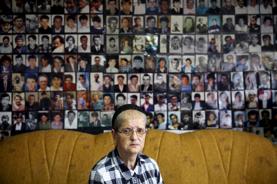 Read moreMejra Djogaz, 66, poses with photos of her three sons and husband in Srebrenica, Bosnia and Herzegovina, on July 4, 2015. Now alone, all she has to remind her of her family are a few photos. #