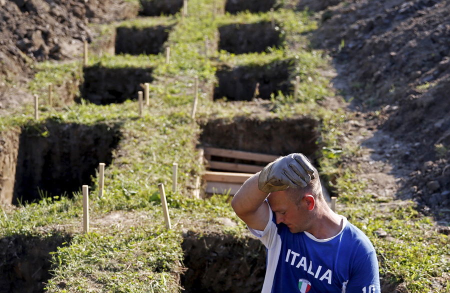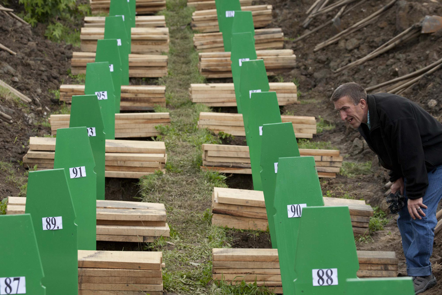Read moreA grave digger wipes his sweat while preparing graves at a memorial center for victims of the Srebrenica massacre in Potocari on July 5, 2015. Tens of thousands of family members, foreign dignitaries and guests are expected to attend a ceremony in Srebrenica on July 11 marking the 20th anniversary of the massacre in which Bosnian Serb forces commanded by Ratko Mladic killed up to 8,000 Muslim men and boys. Nearly 136 identified victims will be buried at a memorial cemetery during the ceremony, their bodies found in some 60 mass graves around the town. #