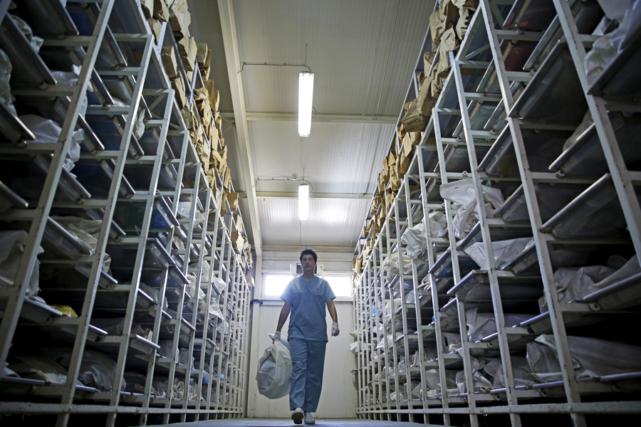 Read moreSenior Forensic Anthropologist Dragana Vucetic of the International Commission on Missing Persons (ICMP) walks through the ICMP center near Tuzla, Bosnia and Herzegovina, on June 11, 2015, during a day at work attempting to identify the remains of a victim of the Srebrenica massacre. #
