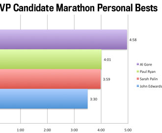 In reading the coverage, what's fascinating to me is 1) How active and impressive the Letsrun.com forum is; 2) how many vice presidential candidates in recent years have run marathons; 3) how good Sarah Palin is at the marathon. Check out this handy chart I made with Runner's World's numbers.