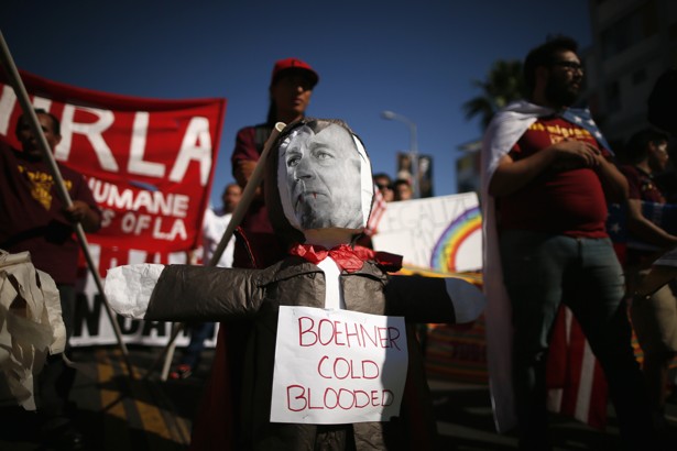 Last week, John Boehner was having breakfast at his customary spot on Capitol Hill, Pete’s Diner, when he was approached by two teenage girls with a video camera. Clad in a baseball cap and fleece pullover, the speaker nervously fiddled with his ear as the pair told him of their undocumented immigrant parents’ fear of deportation. “I’m trying to find a way to get this thing done,” he told them. “It’s, as you know, not easy. It’s not going to be an easy path forward, but I’ve made it clear since the day after the election that it’s time to get this done.”