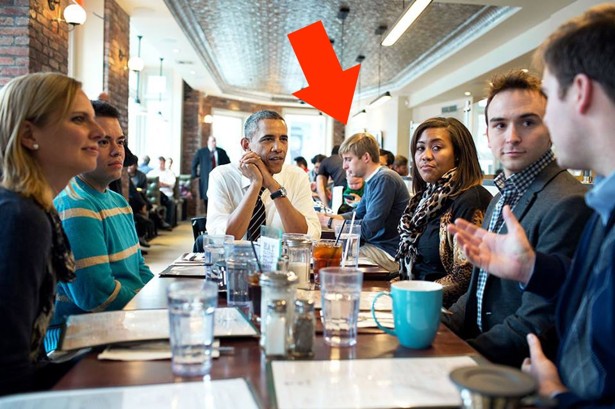 Then the meal was over. Obama got up and took a photo with the five. He put his jacket back down, walked past me, and greeted the rest of the restaurant’s customers. He turned at the end, said good-bye to the baby again as he passed (tousling his hair), rounded the corner, and was gone.