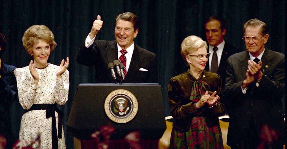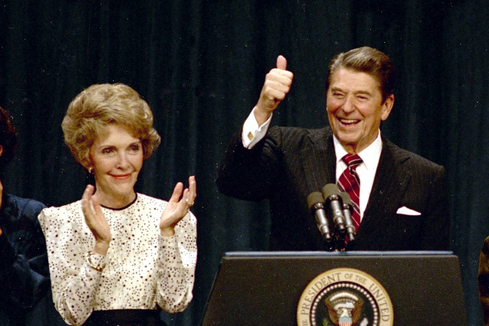 But there is a more significant parallel that has gone unnoticed: Trump is running on essentially the same message as Reagan. Reagan insisted that America’s problems were not as complicated or intractable as everyone seemed to think. “For many years now, you and I have been shushed like children and told there are no simple answers to the complex problems which are beyond our comprehension,” Reagan said at his 1967 inauguration as governor of California. “Well, the truth is, there are simple answers—there are not easy ones.” He made a similar statement in his famous 1964 speech on behalf of Barry Goldwater, and he never wavered from it. The simple answer was to be tough—tough on cutting the budget, tough on domestic protesters, and above all, tough on the world stage. Reagan’s 1980 foreign-policy slogan promised “peace through strength.” He told audiences, “We have to be so strong that no nation in the world will dare lift a hand against us.” One Reagan campaign ad used the word “strength” or “strong” five times in the space of one minute.