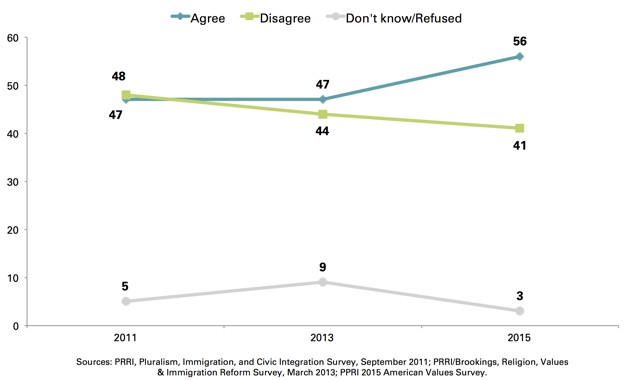 So what changed? Why were those 2001 comments by a Republican president welcomed, while Obama’s very similar comments today were not? Part of it is surely partisanship. But Americans have also become less and less accepting of Islam. When PRRI asked the same question in 2011, for example, just 47 percent of Americans agreed that Islam was incompatible with American values, and 48 percent disagreed.