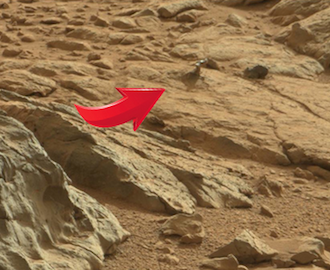 And now we have another Martian Mystery Object -- this one a thing that looks suspiciously like a hunk of metal. Curiosity detected it, through a high-res image taken from its Mastcam, on Sol 173 (January 30 in Earth days). Universe Today calls the object "a small metallic-looking protuberance" -- it resembles a thick, bent nail, sticking out of the Martian surface -- and it is visible in part because it projects a tiny little shadow on the rock below.