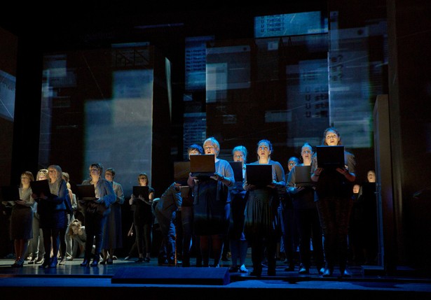 In its choruses, in its gliding towers, the opera gives the Internet dimension. Dancers, moving forward and backward on the stage, give it depth; their jagged stops and starts hint that the web has its own time. They are mimicking computers, which are, themselves, mimicking tools.
