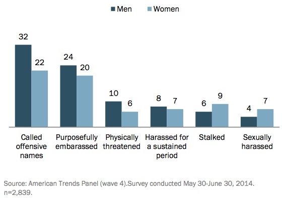 Pew attempted to measure two broad but overlapping types of harassment: less severe harassment like name-calling and attempts to embarrass users, versus more severe forms like physical threats, harassment over a long and sustained period of time, stalking, and sexual harassment.
