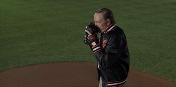 Then, through the magic of the Internet, I started prowling around for other pictures of Kevin Spacey engaged in ball sports. And I discovered that the real-life Spacey had thrown out a first pitch at a real-world major league ball game. He did so last summer at Camden Yards, before an Orioles game. And—well, read the Charm City headline for yourself: