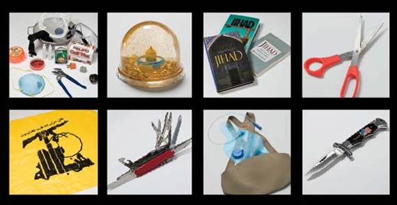 I could have ripped up these counterfeit boarding passes in the privacy of a toilet stall, but I chose not to, partly because this was the renowned Senator Larry Craig Memorial Wide-Stance Bathroom, and since the commencement of the Global War on Terror this particular bathroom has been patrolled by security officials trying to protect it from gay sex, and partly because I wanted to see whether my fellow passengers would report me to the TSA for acting suspiciously in a public bathroom. No one did, thus thwarting, yet again, my plans to get arrested, or at least be the recipient of a thorough sweating by the FBI, for dubious behavior in a large American airport. Suspicious that the measures put in place after the attacks of September 11 to prevent further such attacks are almost entirely for show—security theater is the term of art—I have for some time now been testing, in modest ways, their effectiveness. Because the TSA’s security regimen seems to be mainly thing-based—most of its 44,500 airport officers are assigned to truffle through carry-on bags for things like guns, bombs, three-ounce tubes of anthrax, Crest toothpaste, nail clippers, Snapple, and so on—I focused my efforts on bringing bad things through security in many different airports, primarily my home airport, Washington’s Reagan National, the one situated approximately 17 feet from the Pentagon, but also in Los Angeles, New York, Miami, Chicago, and at the Wilkes-Barre/Scranton International Airport (which is where I came closest to arousing at least a modest level of suspicion, receiving a symbolic pat-down—all frisks that avoid the sensitive regions are by definition symbolic—and one question about the presence of a Leatherman Multi-Tool in my pocket; said Leatherman was confiscated and is now, I hope, living with the loving family of a TSA employee). And because I have a fair amount of experience reporting on terrorists, and because terrorist groups produce large quantities of branded knickknacks, I’ve amassed an inspiring collection of al-Qaeda T-shirts, Islamic Jihad flags, Hezbollah videotapes, and inflatable Yasir Arafat dolls (really). All these things I’ve carried with me through airports across the country. I’ve also carried, at various times: pocketknives, matches from hotels in Beirut and Peshawar, dust masks, lengths of rope, cigarette lighters, nail clippers, eight-ounce tubes of toothpaste (in my front pocket), bottles of Fiji Water (which is foreign), and, of course, box cutters. I was selected for secondary screening four times—out of dozens of passages through security checkpoints—during this extended experiment. At one screening, I was relieved of a pair of nail clippers; during another, a can of shaving cream.