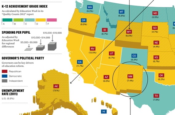 New Mexico’s suburban Rio Rancho district has the best ROI in the state, spending just $6,658 per pupil for an achievement score of 61, which cap calculated on a scale of 1 to 100. Just two districts away, rural Jemez Mountain had the worst ROI, spending $13,983 per pupil for an achievement score of 25.