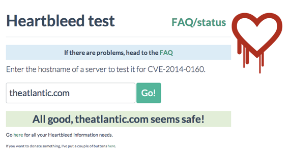 Point 1: If you would like to test to see whether a site is exposed to the loophole created (over the past two years) by the OpenSSL bug, you can go here and enter the URL you are concerned about. (This tip via Bruce Schneier.) As explained in the FAQ, the test sometimes delivers "false positives" for vulnerability -- that is, it may report problems with a site that actually is OK, or that is in the middle of taking steps to protect itself. But the site's creator explains why "false negatives" -- OK signals when there actually is a problem -- should be very rare, and especially if you perform the test several times. Update Here is another good test site.