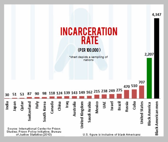 Update: An earlier version of this post included a chart that compared black America's incarceration rate with those of other countries. The chart incorrectly listed black Americans' incarceration rate in 2010 as 4,347 per 100,000 Americans. In fact, that is the rate for black American men. The rate for black American women is 260 per 100,000 Americans, .