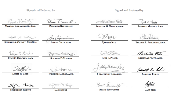 The people running The Iran Project are about as august a group of experts as you could find, largely former ambassadors or security advisors from both Republican and Democratic administrations. The image at the top is a screen-grab of a signature page showing some of their names. One member of the panel, longtime CIA official Paul Pillar, has explained its implications this way:
