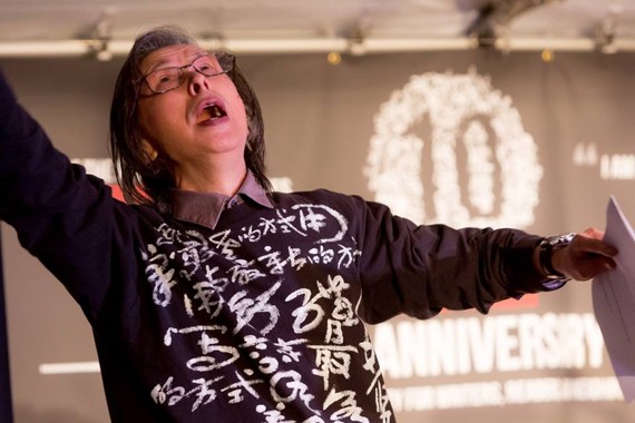 Huang Xiang returned from his home in New York for a stellar performance of his work (see first photo), A Promise to Meet in This Life. He flashed the biggest, brightest smile in the world, courtesy a generous Pittsburgh dentist who took two careful years to make Huang’s new teeth. Horacio Castellanos Moya, of El Salvador, performed via Skype from Chile, where he was receiving an award for his fiction writing from president Michelle Bachelet. Burma's Khet Mar stopped en route from Washington, where she now works for Radio Free Asia, to a month’s visit to Hong Kong. The night inside the tent ended with celebratory cakes and audacious sparklers, a fitting launch for the next ten years of Pittsburgh’s City of Asylum.
