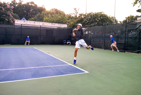 Previously on the “watching real tennis players up close” series, we have this report on what I learned from watching Roger Federer play doubles during the Beijing Olympics, and this one on watching 6’10” John Isner serve in Washington a few years ago. And what I can tell you about Andy Murray (serving below) from a few yards away last night is that he is imposingly big and strong, football tight-end style.
