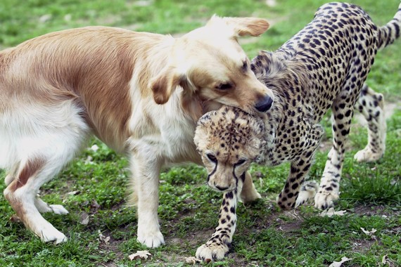 So far, most of the interspecies relationships researchers have observed have happened in captivity—possibly because the probability of seeing one among zoo or household is just higher than happening upon it in the wild, but also because animals living in the world of humans are just more likely to interact with other species from a young age. There’s a reason so much of the Internet’s interspecies-friendship porn focuses on baby animals: The strongest bonds form early. Studies have shown that geese and ducks raised together will view each other as members of the same family; kittens raised with baby rats would never harm them. If a relationship takes root early enough in an animal’s social development, it can overrule instinct or later learned behavior. (The San Diego Zoo assigns “puppy buddies” to each of its cheetahs from birth, to help the cats learn to be more playful, and other zoos have similar programs.)