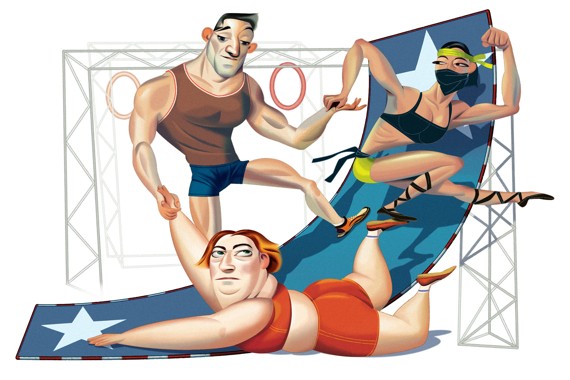 There’s a lot of bodywork happening on reality TV right now—bodies in training, bodies on trial, bodies stretching and twanging at the highest pitch of performance. NBC’s Spartan: Ultimate Team Challenge is the muddiest of the shows: five-person teams floundering through a one-mile obstacle course, writhing under barbed wire, flinging spears, bellowing like bulls. By contrast, the same network’s American Ninja Warrior, currently prepping for its ninth season, is the most joyously and aerially spectacular. Competitors dance across toadstool-like steps, cling to jolting barrels, swarm up netting, go hand over hand above a pool of water through an inverted forest of dangling, diabolical grips, and then launch themselves in madness at the Warped Wall: an almost completely vertical ramp that looms over the course like a stalled wave, a black reef of impossibility. Aficionados will tell you that the early seasons of ANW were the best, as the open-to-all qualifying rounds, held in cities across the United States, activated an occult subculture of weightless individualists—extreme sportsmen, stunt doubles, mystic free runners, and human flies. (One hectic apprentice memorably attempted the course in flowing robes, with a sword hanging from his belt.) On the other hand, increased competition has heightened the level of athleticism, and women have entered the game in a serious way. “She is a beast,” marveled co-host Akbar Gbaja-Biamila at the 2015 Venice Beach finals, watching the extraordinary Jessie Graff bounce, tumble, and waft through the course with a flickering half-smile on her face.