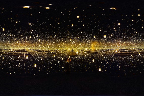 Aftermath of Obliteration of Eternity (2009) was Kusama Heavy. Was she perhaps taking on Hiroshima and Nagasaki? With small lights hung low in the darkened and mirrored room, this work evokes the look and feel of toro nagashi, the ceremony in which paper lanterns are lit and floated down a river in the evening. I had the by-now familiar feeling of being small and absorbed in some vastness, where I knew no one but myself. This time the experience was exhilarating. I was on the dock of the bay of infinity. I had no urge to hide myself. I was only a silhouette anyway. I didn’t want to leave, but my minute was up.