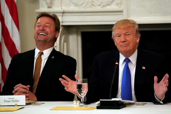 Trump, however, wasn’t ready to give up. At the outset of the private meeting with Republicans, Trump delivered a performance for the cameras—and for the assembled senators—that was at times cajoling, bizarre, and lightly threatening. The White House seated one of the bill’s most prominent holdouts, Senator Dean Heller of Nevada, directly to Trump’s right, and the president needled him for his opposition and suggested it might cost him his job next year. “He wants to remain a senator, doesn’t he?” Trump said as Heller smiled gamely. Then he made an even more pointed reference to the senators who have said they would block repeal legislation from coming up for a vote. “Any senator who votes against starting debate is really telling America that you’re fine with Obamacare,” the president said. (Heller, though firmly opposed to the initial McConnell draft, is officially undecided on the current version.)