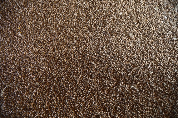 To understand why the climate impact of beef alone is so large, note that the image at the top of this story is a sea of soybeans in a silo in the Brazilian Amazon rainforest. The beans belong to a feed lot that holds 38,000 cattle, the growth and fattening of which means dispensing 900 metric tons of feed every day. Which is to say that these beans will be eaten by cows, and the cows will convert the beans to meat, and the humans will eat the meat. In the process, the cows will emit much greenhouse gas, and they will consume far more calories in beans than they will yield in meat, meaning far more clearcutting of forests to farm cattle feed than would be necessary if the beans above were simply eaten by people.