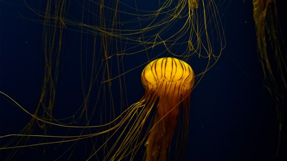 A map of the range of jellyfish species on the wall read global domination. As the crowd thinned out, I saw blue blubber jellies from Australia—studded balls like spaniels’ chew toys—in an underlit tank that went from red to green to red. I saw the Pacific sea nettle, Vaseline- and cola-colored; I saw jellyfish that looked like the crushed Kleenex swept out of a house of mourners. A plaque boasted that “up to 5,000 jellyfish were bred behind the scenes as Ocean Invaders got ready to open.” How strange to think of this swarm, cosseted and captive in so many glass tanks, when beyond the aquarium such a prodigious bloom would be eyed with trepidation, as a jittery forecast for the future of oceans.