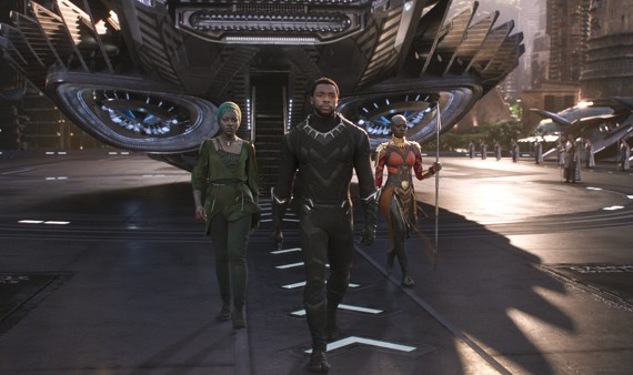 Black Panther picks up where Civil War leaves off. (Mild spoilers ahead.) T’Challa is finding his footing as the new king in the aftermath of his father’s death. Among his Wakandan countrymen and retinue are a number of remarkably fleshed-out characters with complex relationships, and a veritable who’s who of black actors, including Letitia Wright as his sister Shuri; Lupita Nyong’o as his ex-flame Nakia; Danai Gurira as Okoye, the head of his all-women bodyguard; and Daniel Kaluuya as his best friend W’Kabi.