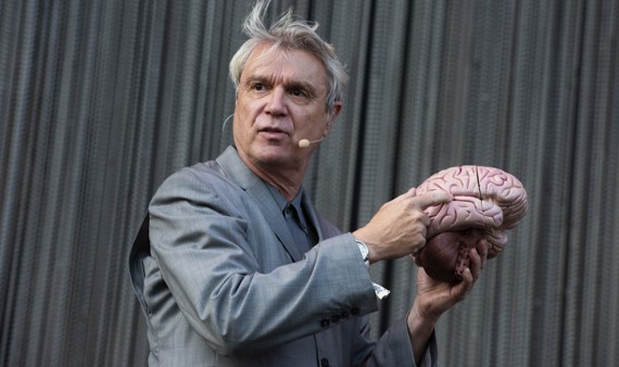 Byrne, at long last, has scrapped the essential trappings of a rock show. There’s no drum kit centering the eye. No amps stand like boulders. Rather, the musicians serve as the only furniture—and they move. Most play marching-band style, strapping their bodies with keyboards or a museum’s variety of percussion instruments (most concertgoers will struggle to identify the devices being thwacked and scraped). Each performer is also a performance artist, moving their feet and sticks in preplanned patterns. Joining them are two dancers, one of whom resembles Veep’s Matt Walsh in cabaret makeup.