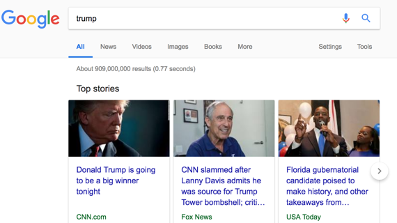 Tuesday, President Trump tweeted that Google “RIGGED” search results, saying “96 percent of news search results on ‘Trump News’ are from National Left-Wing Media, very dangerous.”