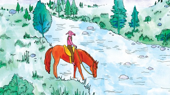 Hanawalt’s illustrations do a lot of the work to visually disassociate Coyote Doggirl from its black-and-white or sepia-toned predecessors. Close to sunset, the sky in Coyote Doggirl is filled with cotton-candy-pink clouds; in the day, it glows the color of a ripe lemon. The mountains and pebbles and trees are often a smudged indigo. Sometimes the background vanishes altogether, homing in on Coyote’s ecstasy as she takes a new horse for a spin, or on her mindlessness as she performs chores. (Not everything is rendered so delightfully: A traumatic memory materializes in washes of deep blues and blacks—and then a sickening ribbon of crimson.) For fans of the artist’s comics or BoJack Horseman, it’s an unmistakable aesthetic. Hanawalt’s soft-edged watercolors complement the looseness of the narrative, which is linear but interspersed with playful detours and snapshots of Coyote’s inventory (harmonica, rations, rope, revolver).