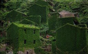 Once a thriving community, the now-empty brick houses of Houtouwan stand completely covered by blankets of vegetation.