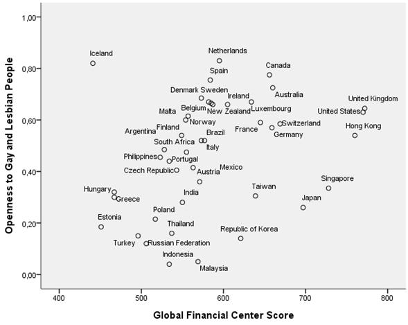 We also looked at the relationship between global financial centers and another measure of openness -- attitudes toward gay and lesbian people, also from Gallup surveys. And we again found a reasonably close association. The correlation was .27, but not statistically significant for a nation's combined score, and .32 when we used the highest-ranked financial center.