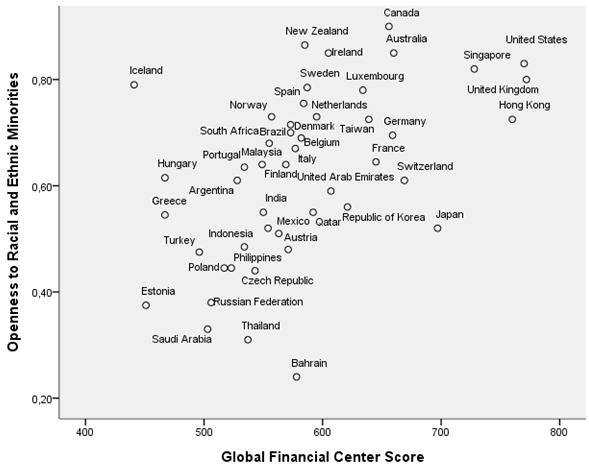 The ability to attract talent has long been a defining characteristic of leading global financial centers. Cassis writes that: "The crucial contributory factor in the financial center's development over the last two centuries, and even longer, is the arrival of new talent to replenish their energy and their capacity to innovate." So we looked at the relationship between global financial centers and a proxy measure for openness to global talent - data on attitudes toward racial and ethnic minorities from Gallup surveys. And we found a reasonably close association. The correlation was .4 when we used the combined score of all of a nation's financial centers and .51 when we used its highest-ranked financial center.
