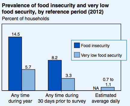 First, the big picture: hunger rates jumped after the recession, and have yet to come down. In 2012, 14.5 percent of households suffered from some form of food "insecurity," which essentially means they had to worry about putting dinner on the table, might not have been able to afford a balanced diet, but weren't necessarily skimping on meals. The upshot: almost 49 million adults and children couldn't always count on where their next bite was coming from.