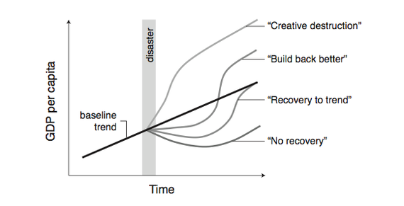For years economists have debated whether destructive storms are even bad for a country's economy. To a non-economist, the ill effects of a storm might seem intuitive, but economists have a knack for finding plausible counterintuitive explanations. When it comes to a major natural disaster, they had four competing hypotheses: Such a disaster might permanently set a country back; it might temporarily derail growth only to get back on course down the road; it might lead to even greater growth, as new investment pours in to replace destroyed assets; or, possibly, it might yet even better, not only stimulating growth but also ridding the country of whatever outdated infrastructure was holding it back. Woohoo.
