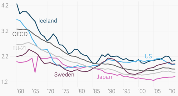 Of course, getting more women to work isn’t the only way to keep a country’s economy humming; you can also buy workers from other countries. The U.S. prefers this approach, relying heavily on a temporary worker program to supplement its workforce. Immigrants are usually young and healthy, and therefore tend to contribute more taxes than they take in services from the state (even many illegal workers pay taxes). But the lack of employment protections or financial security means that they neither produce nor consume as much as they might. And the risk of a labor shortage always looms.