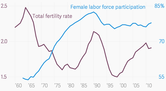 Paradoxically, upping female employment levels appears to stave off this peril. Women in countries with higher female employment rates give birth to more children, on average, according to Goldman Sachs.