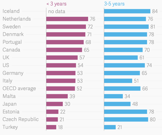 Japan is hardly alone in failing to grasp this, however. More than 100 countries now provide government-funded cash benefits for maternity leave; only 70 offer paid paternity leave. Even among OECD countries, only two-thirds offer paternity leave, and even those often for no more than a few weeks. Only three countries—Chile, Portugal, and Italy—make a few days of paternity leave compulsory.
