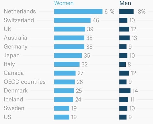However, Sweden’s part-time work gender gap is much smaller than that of other countries. And unlike pretty much any other country, Swedish women who work part-time are paid at the same rate as those who work full-time, according to a 2008 study; some even enjoy a small pay premium.