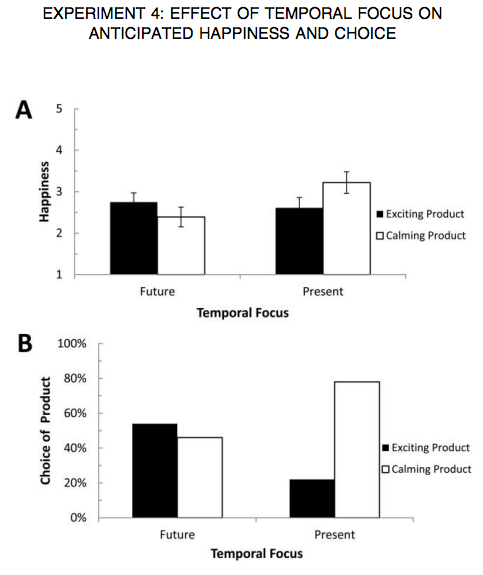 In one of their studies, Cassie Mogilner and other researchers primed participants to think about the future or the present with word scrabbles. Then they were offered two brands of water, one called Pure Calm and one called Pure Excitement. Prompting consumers to think about the here-and-now made them significantly more likely to prefer a product that promised calmness.